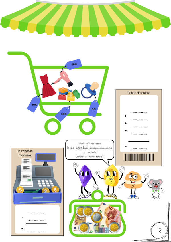 Conçu spécialement pour aider les enfants à apprendre un concept parfois compliqué, ce livret d’apprentissage est ludique et éducatif. Grâce à des scénarios inspirés du jeu de la marchande, ils développent leur sens de l’observation, leur logique, et leurs compétences en calcul mental.