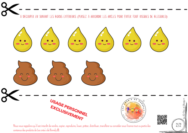 “Sur le chemin de la propreté” est un outil ludique et motivant pour accompagner les jeunes enfants dans l’arrêt de la couche pendant la journée. Ce support est constitué de vignettes à scratch représentant le pipi et le caca. Après chaque passage réussi sur le pot ou aux toilettes, l’enfant est invité à coller la vignette correspondante sur le support. Ce geste valorisant et concret l’encourage et le motive, tout en marquant ses progrès. Ce support permet de rendre le processus d’apprentissage de la propreté amusant et positif, de plus il valorise les progrès de l’enfant et instaure une routine rassurante. Mais ce n’ai pas tout : le support inclut également les étapes essentielles de l’hygiène après être allé aux toilettes, pour aider l’enfant à adopter les bons gestes.